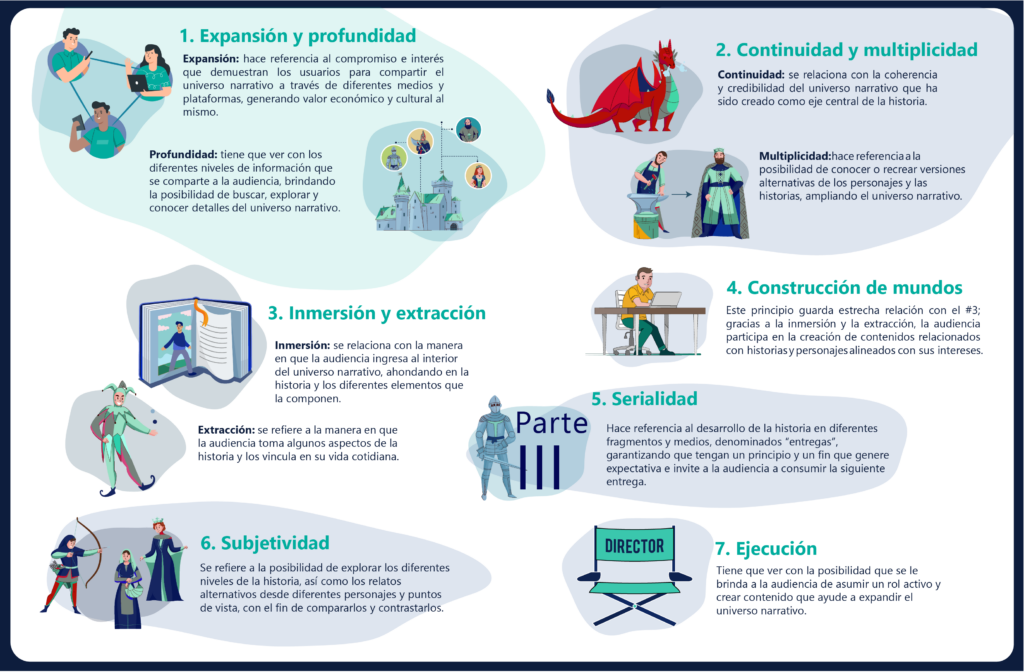 Henry Jenkins propone siete principios a tener en cuenta para el desarrollo de narrativas transmedia, estos son: